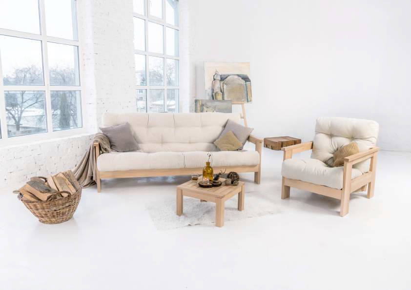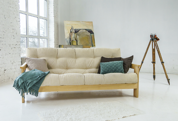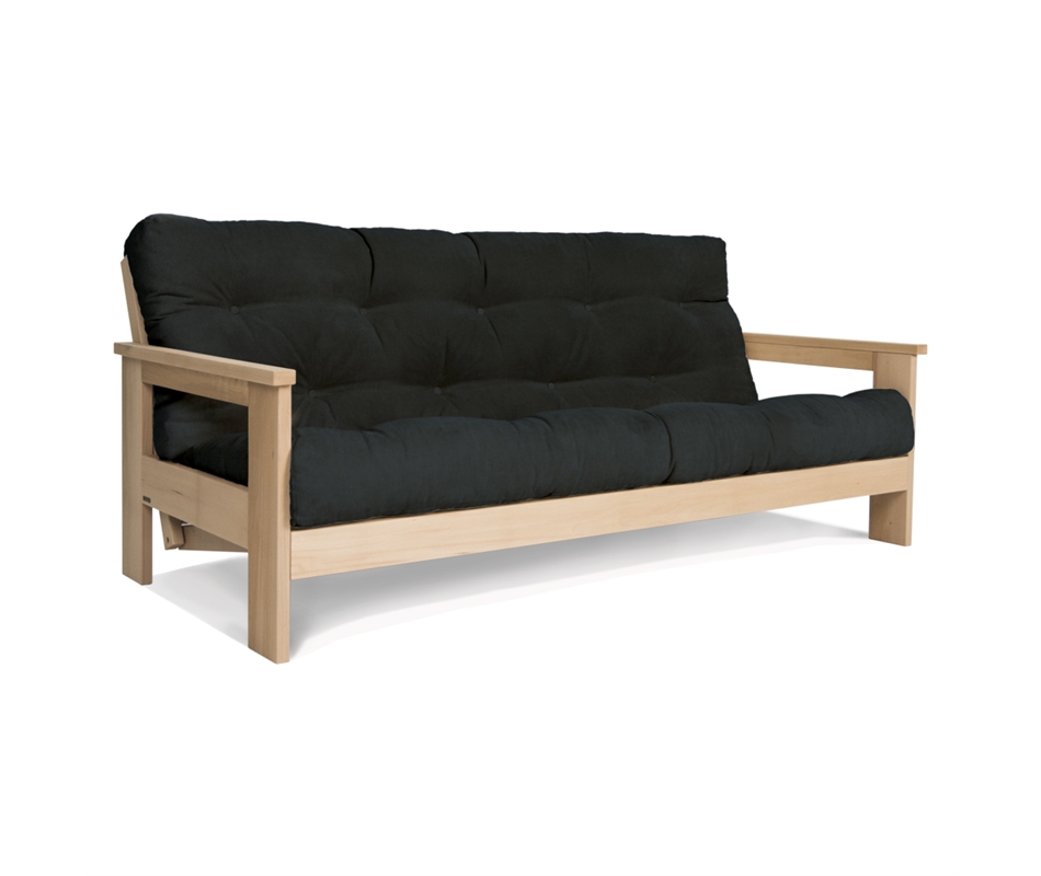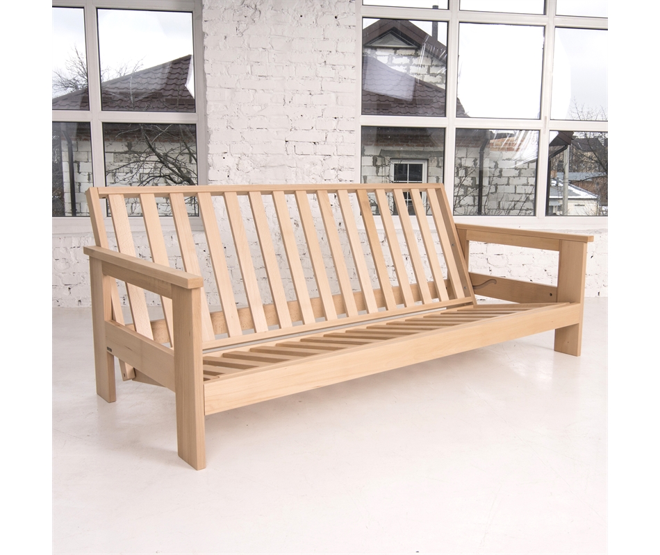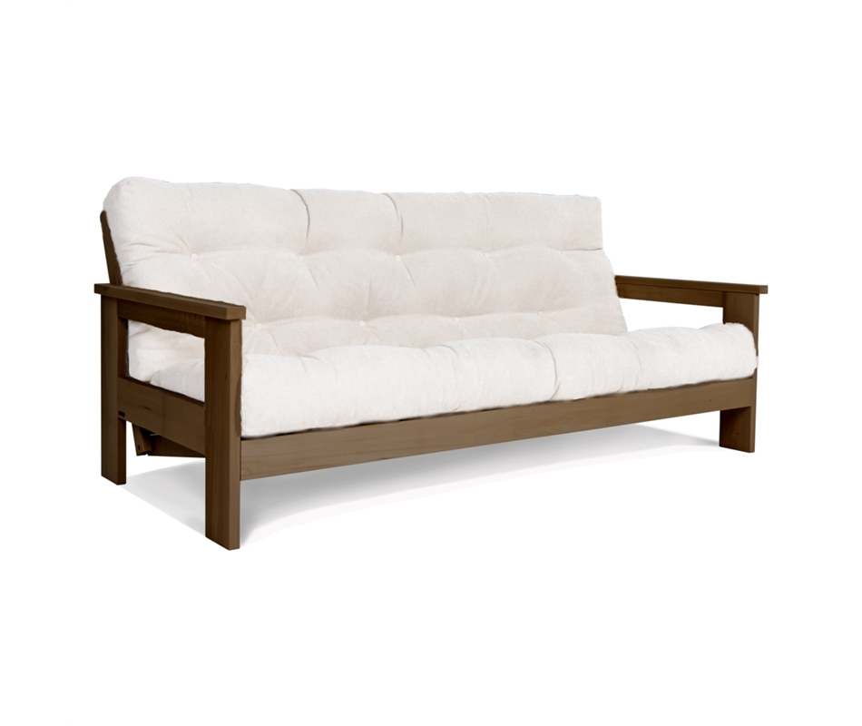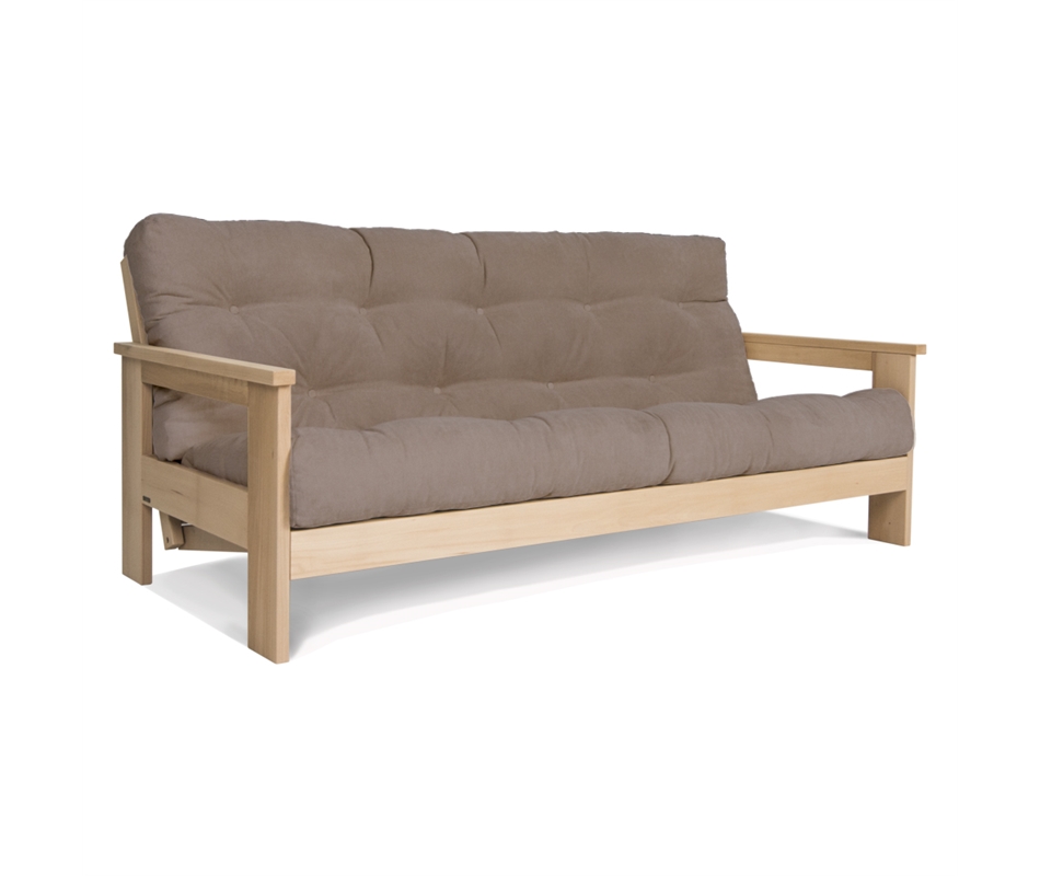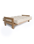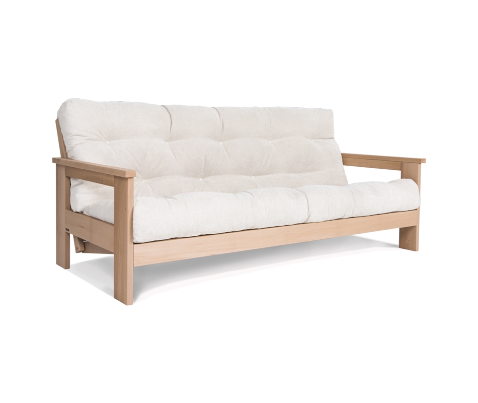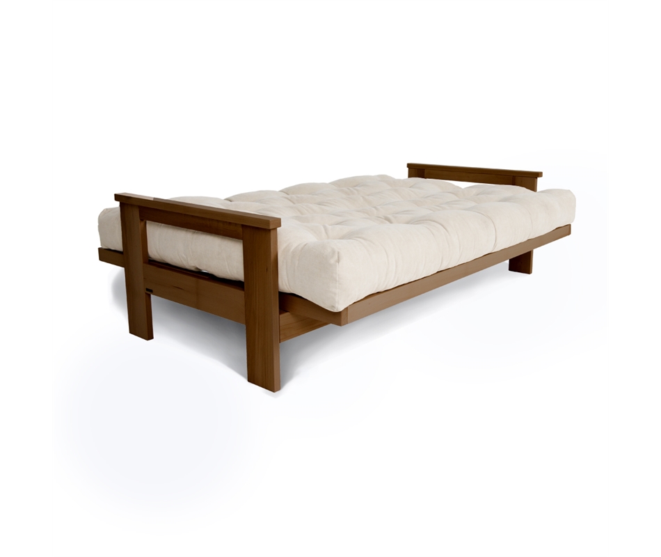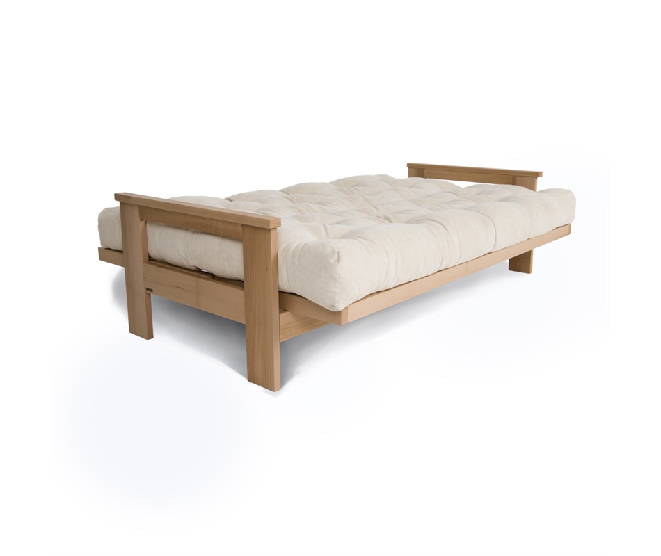 Divano letto in legno di faggio . Semplice e dotato di comodi braccioli. Si trasforma in letto alla francese. Il divano letto viene fornito di serie nella colorazione naturale o noce, realizzate con olio di lino, oppure non trattato. Struttura in legno di produzione europea, futon Viverezen realizzato in Italia. Futon 140x200 alto 10 cm in cotone con inserto in polilatex. Il futon ha un rivestimento non sfoderabile in cotone greggio (color ecrù). In alternativa puoi scegliere di personalizzar...