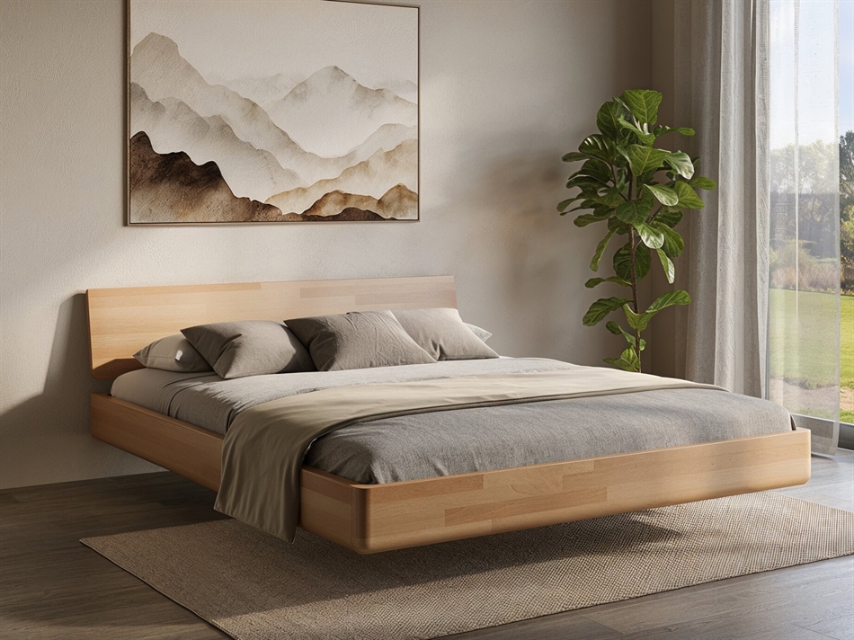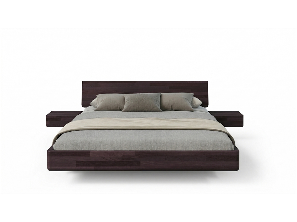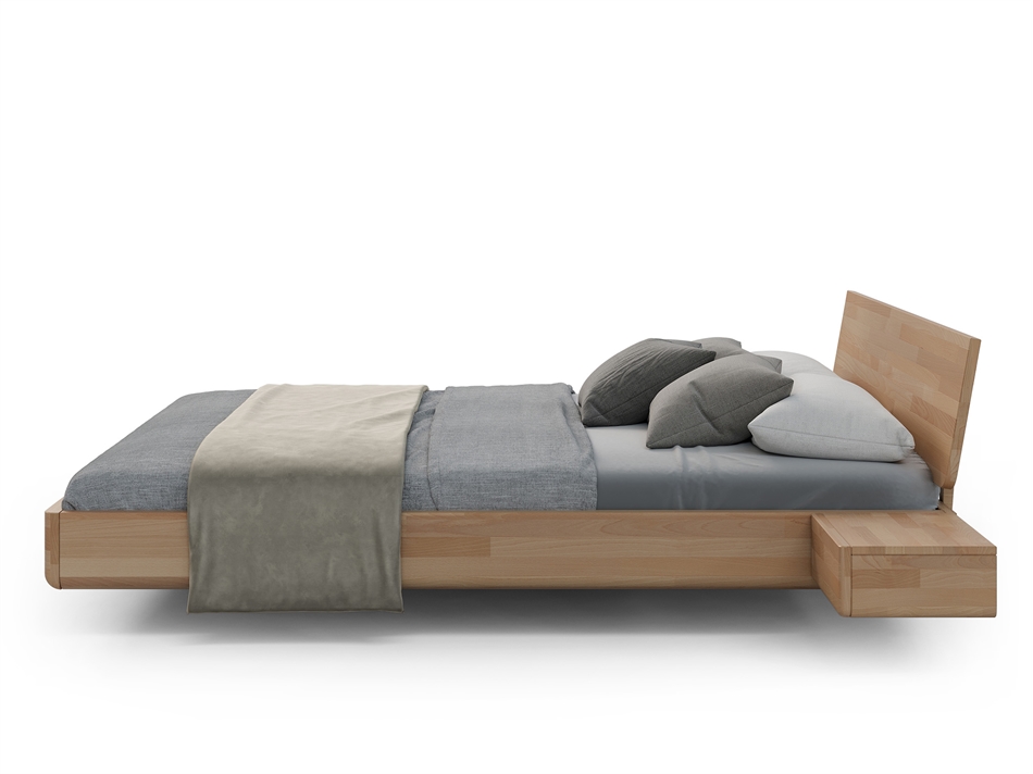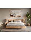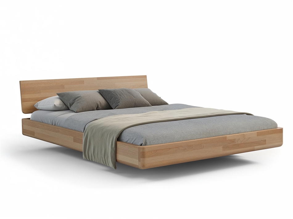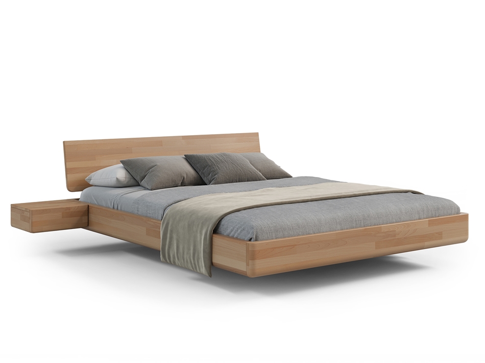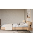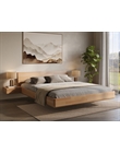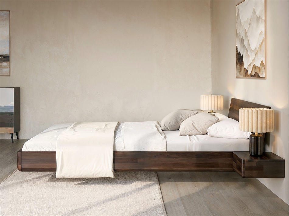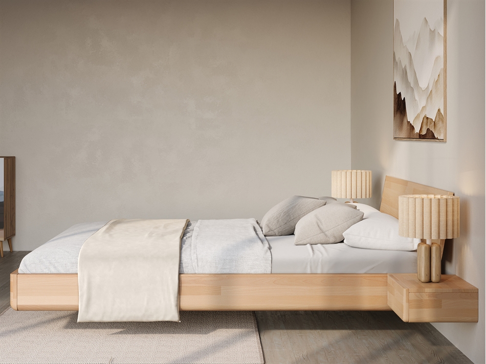 Il letto ha uno stile semplice, caratterizzato dagli angoli arrotondati della testiera e dei piedi. L'effetto sospeso creato dall'ampio bordo di legno e i piedi rientranti, si adatta a un ambiente moderno come a uno più giapponese.
