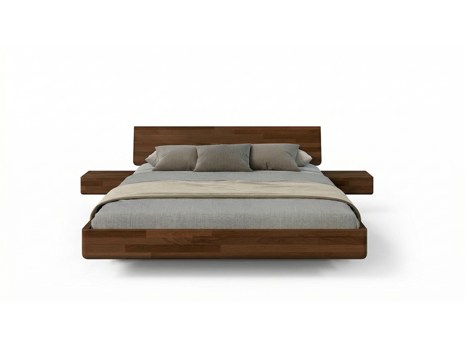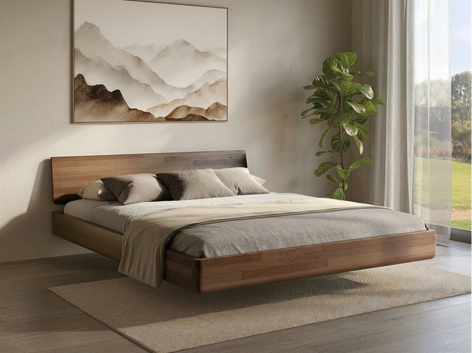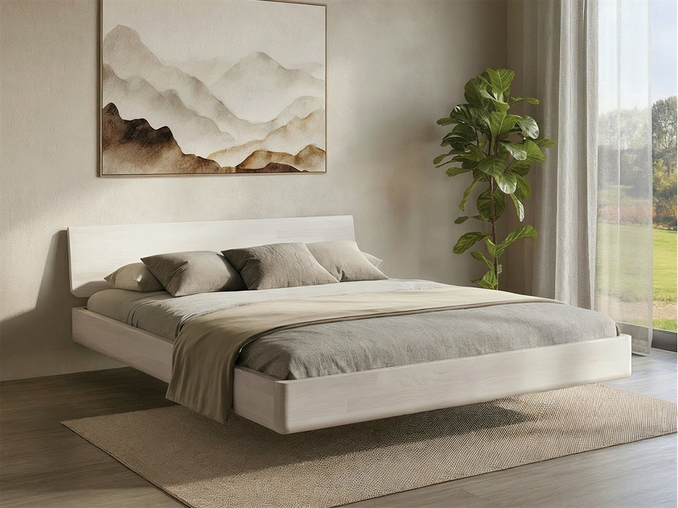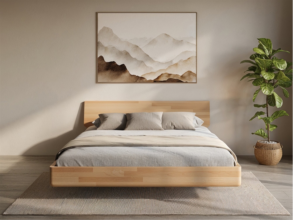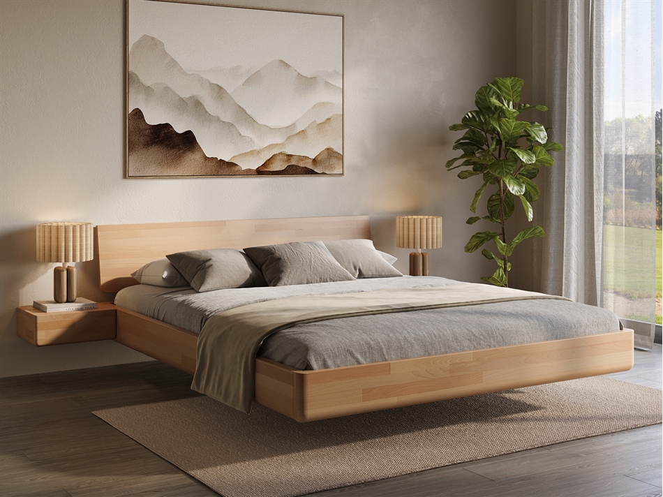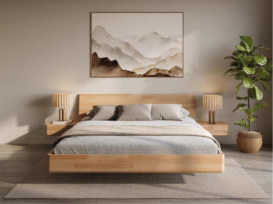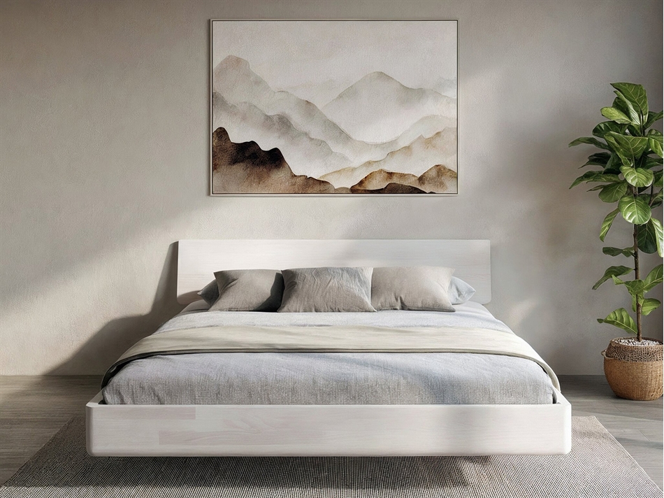 Il letto ha uno stile semplice, caratterizzato dagli angoli arrotondati della testiera e dei piedi. L'effetto sospeso creato dall'ampio bordo di legno e i piedi rientranti, si adatta a un ambiente moderno come a uno più giapponese.